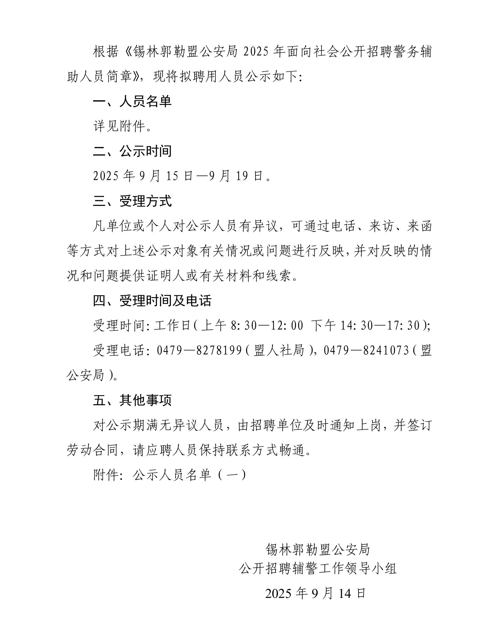 錫林郭勒盟公安局2025年第二批面向社會(huì)公開招聘警務(wù)輔助人員擬聘用人員公示(一)