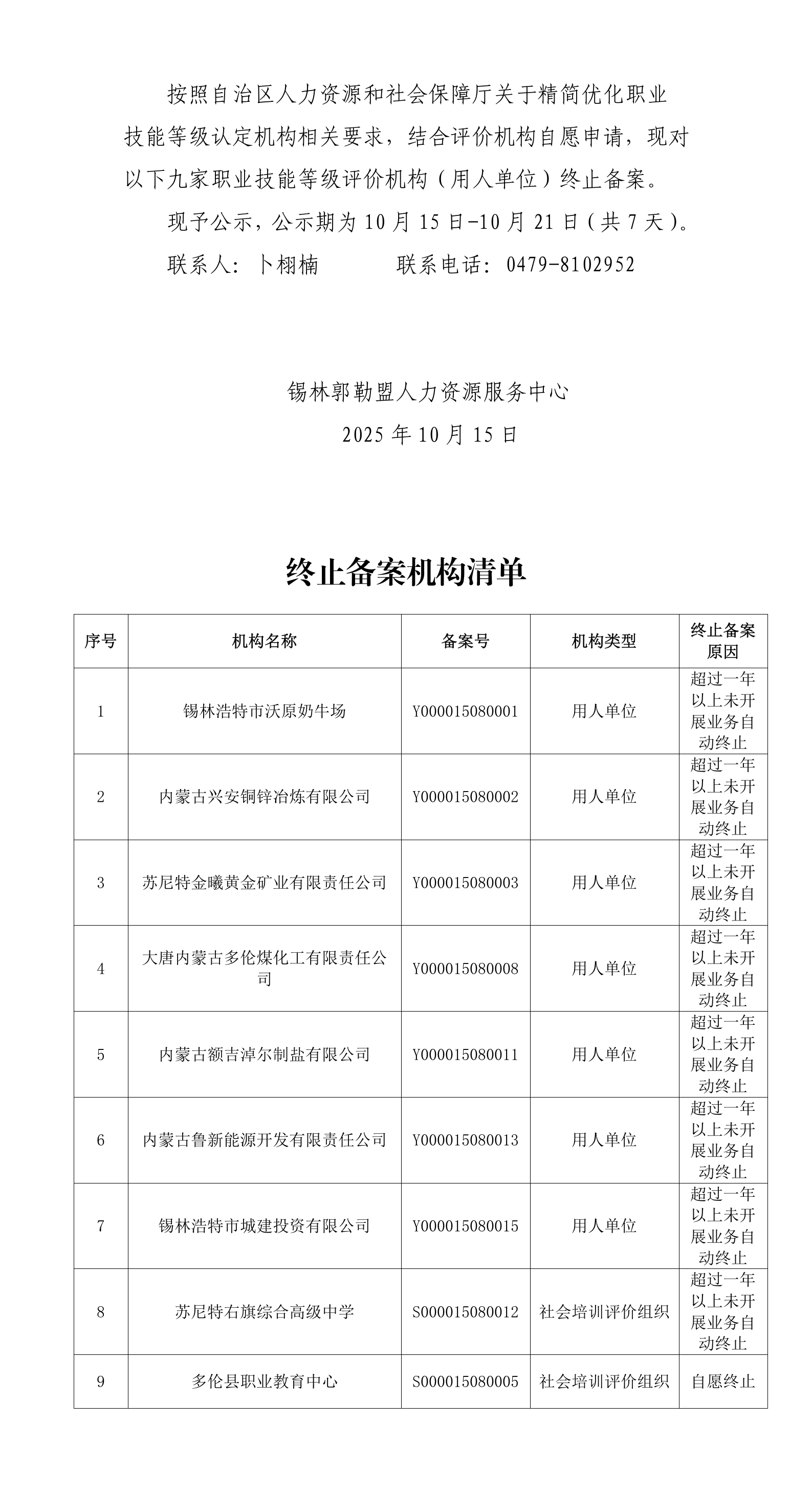 錫林郭勒盟職業(yè)技能等級(jí)認(rèn)定機(jī)構(gòu)終止備案的公示